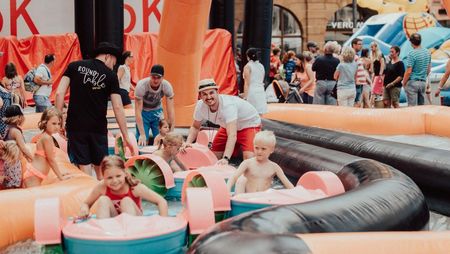 Die Besucher erwarten eine 5 Meter hohe und 25 Meter lange Wasserrutsche, eine Nemo-Wasserrutsche für die Kleinen, ein Wasser-Fußballfeld, in welchem zwei Teams gegeneinander Fußball spielen können, ein Kinder-Tretbootparcours, Aqua-Zorbing und eine „Tauchstation“. Außerdem werden direkt vor Ort Umkleidekabinen und eine Garderobe aufgebaut. Für diejenigen, die das Wasserspektakel lieber trocken erleben möchten, werden eine Summer-Lounge aus Palettenmöbeln, Essens- und Getränkestände und am Samstag-Abend ein DJ sowie eine Cocktail-Bar geboten.
