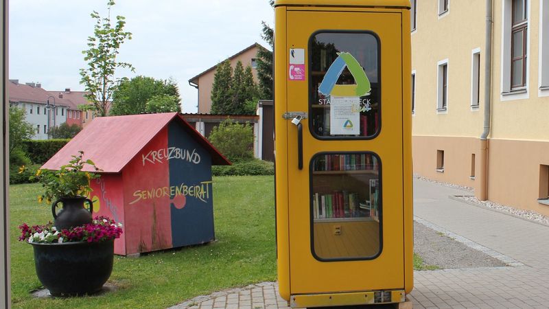 Gelbe Bücherzelle freut sich jetzt vor dem ...