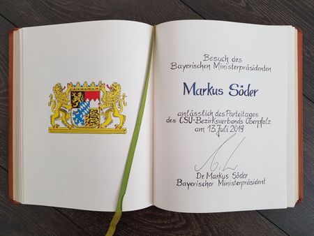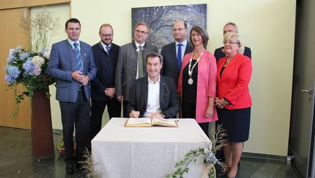 Die Hausherrin Bürgermeisterin Dr. Plank begrüßte den Ehrengast sowie zahlreiche Vertreter der Politik, wie Staatsminister Albert Füracker, Landtagsabgeordneter Alexander Flierl, Staatsministerin a. D. Emilia Müller und Landrat Thomas Ebeling. Nach einem musikalischen Empfang durch die Jugendblaskapelle der freiwilligen Feuerwehr Leonberg unter der Leitung von Regina Sturm, trug sich der Ministerpräsident in das Goldene Buch der Stadt Maxhütte-Haidhof ein. Er freue sich und wünsche der Stadt alles Gute. Er sei gerne gekommen, so Dr. Söder. Nach dem Eintrag überreichte Dr. Plank noch einen Geschenkkorb an den Ministerpräsidenten mit Spezialitäten aus der Umgebung sowie der Maxi Maus, welche Söder ein herzhaftes Lachen entlockte. „Wir freuen uns sehr, dass der Bayerische Ministerpräsident Dr. Markus Söder sich in das Goldene Buch der Stadt Maxhütte-Haidhof eingetragen hat. Ein Tag, auf den wir als Stadt Maxhütte-Haidhof stolz sein können“, freut sich die Bürgermeisterin.