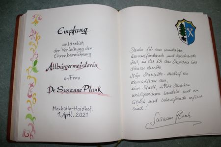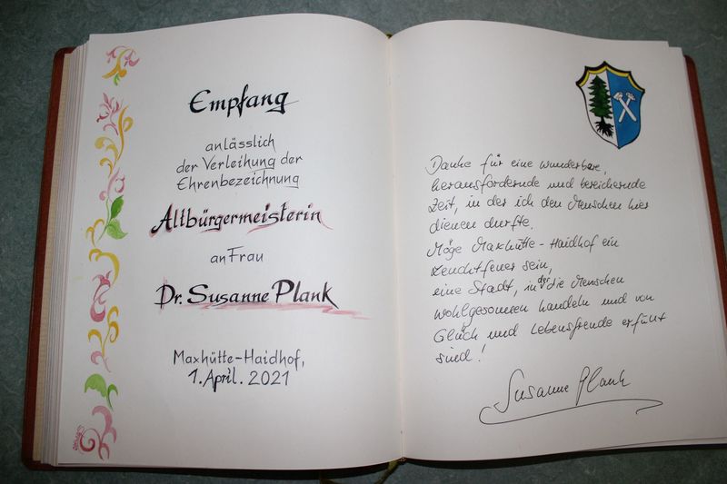 „Aus gegebenem Anlass können wir Dir heute jetzt erst diese Auszeichnung übergeben. Von Mai 2008 bis April 2020 hast Du als Bürgermeisterin die Geschicke in Maxhütte-Haidhof gelenkt und hast Dich mit aller Kraft für unsere Stadt eingesetzt. Wir und damit meine ich den letzten und den jetzigen Stadtrat zollen Dir hohen Respekt, was Du alles geleistet hast“, dankte ihr Rudolf Seidl auch im Namen der Gemeinde. Sozusagen als ihre „letzte Amtshandlung“ trug sich Dr. Susanne Plank in das Goldene Buch der Stadt Maxhütte-Haidhof mit einer Widmung ein.