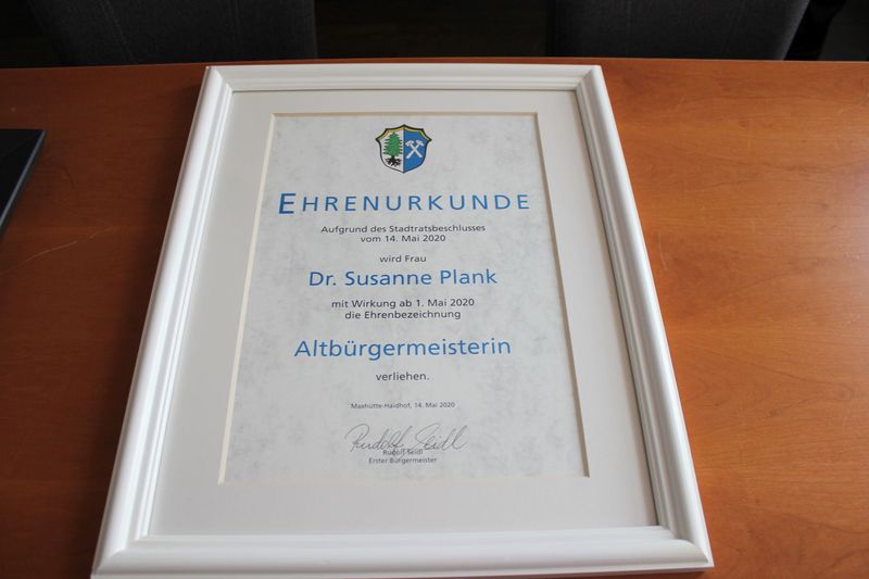 MAXHÜTTE-HAIDHOF. Im Mai 2020 hat Rudolf Seidl den Platz im Rathaus von Dr. Susanne Plank übernommen. Jetzt überreichte er seiner Vorgängerin die Urkunde, mit der ihr der Ehrentitel als „Altbürgermeister“ verliehen wurde. Bereits im letzten Jahr hat der Stadtrat dies einstimmig beschlossen.