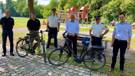 SCHWANDORF. Die Sicherheitswacht der Polizeiinspektion Schwandorf wurde von der Stadt Schwandorf mit einem zweiten Elektro-Fahrrad ausgestattet. Oberbürgermeister Andreas Feller übergab persönlich im Schwandorfer Stadtpark das Fahrrad an Armin Kiener und Thomas Faderl von der Sicherheitswacht, die nun auch zu zweit mit den Fahrrädern auf Streife fahren können.