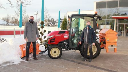 Der Hallenwart der Stadthalle, Harald Griesbeck sowie sein Kollege Andreas May und der Hausmeister der Grundschule, Andreas Albrecht nahmen das 35 PS-starke Gefährt in Empfang. Auch bei diesem Kauf wurde der Umweltgedanke mit berücksichtigt: Der Motor ist durch minimierte Emissionen sehr umweltfreundlich. Ein zuschaltbarer Allradantrieb sorgt für zusätzliche Zugkraft. Eingesetzt wird das Gerät hauptsächlich für Schneeräumarbeiten aber auch für Instandhaltungsarbeiten auf dem Gelände der Stadthalle und der Maximilian-Grundschule.