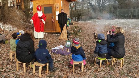Der Heilige Nikolaus und Bürgermeister Rudolf Seidl wünschten den Kindern und deren Erzieherinnen und Erziehern trotz der Coronakrise noch „eine ruhige Adventszeit und ein schönes Weihnachtsfest“. Die Kinder dankten dem Besuch mit Gedichten oder Liedern sowie Winken durch die Fensterscheibe.