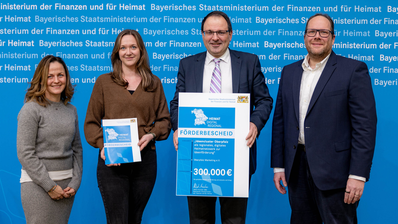 REGENSBURG. Das neue Projekt „Ideencluster Oberpfalz" des Oberpfalz Marketing e. V. startet offiziell in seine dreijährige Laufzeit. Im Rahmen der Heimat-Digital-Regional-Förderrichtlinie unterstützt das Bayerische Staatsministerium der Finanzen und für Heimat das innovative Vorhaben mit 300.000 Euro Fördermitteln. Den offiziellen Förderbescheid übergab Martin Schöffel, MdL und Staatssekretär, im Bayerischen Staatsministerium der Finanzen und für Heimat in Nürnberg.