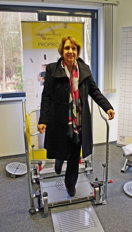 Beim Ausklang des Besuchs im Ausstellungsraum durfte natürlich ein Test-Sitzen der Bioswing-Stühle sowie ein Ausprobieren verschiedener Therapie- und Trainingsgeräte nicht fehlen. Von der Feinfühligkeit des Bioswing-Systems überzeugte sich MdL Karl unter anderem anhand eines Demomodells. Das eigene körperliche Feingefühl und Balancevermögen stellte sie abschließend auf der schwingend gelagerten Therapieplattform Posturomed unter Beweis.