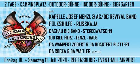 REGENSBURG. Zum ersten Mal geht in diesem Jahr am 9. und 10. Juli 2021 das Love, Peace & Blasmusik im und auf dem Freigelände der Eventhall Airport Obertraubling über die Bühne. Es gibt hier eine Outdoorstage, Indoorstage, einen Biergarten mit Bühne und auch einen Campingplatz. Das Line-Up kann sich auf jeden Fall sehen lassen. Hippie Lebensgefühl gepaart mit pulsierender Livemusik der angesagtesten Blasmusik-Kombos.